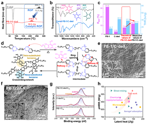 近日,该团队利用生物基原料的多样性,设计合成了一种含长链结构的苯并噁嗪单体,直接用作有机PCM,同时制备了一种含丰富酚羟基的聚苯并噁嗪气凝胶,用于负载苯并噁嗪基PCM。由于苯并噁嗪单体独特的开环聚合反应机制,所得的PCC能够在开环聚合温度以下稳定地进行储热/放热,在高温时,内部的苯并噁嗪基PCMs的开环聚合能被酚基单元引发,进而相互交联并形成具有高残炭率和本征阻燃性的聚苯并噁嗪块体材料。该策略无需引入或添加额外的阻燃成份,很好地兼顾了PCC所需的阻燃安全性和储热能力,为有机PCC的阻燃设计提供了可行的解决思路。