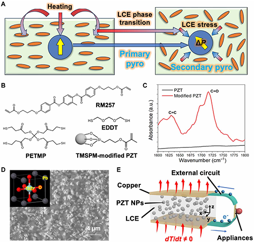 在全球能源短缺和可再生能源利用需求增长的背景下,如何高效地回收和利用环境中的废热成为科研热点。据统计,美国超过 60% 的总发电量以废热形式损失。传统的热电转换方法(如塞贝克效应)在环境温度分布均匀的情况下难以发挥作用,而热释电效应因能够利用温度波动进行能量收集而备受关注。本研究提出了一种基于LCE和PZT纳米颗粒的复合材料,该材料不仅具备热释电特性,还能够通过 LCE 产生的热应力增强二次热释电效应,进而提高整体的热电转换性能。相比于常见的柔性热释电材料,如聚偏氟乙烯(PVDF),本研究的LCE/PZT 复合材料的热释电系数提升了 49%。研究团队采用了两步硫醇-丙烯酸酯迈克尔加成反应制备 LCE 薄膜,并在其中均匀分散由甲基丙烯酰氧基硅烷(TMSPMA)表面修饰的 PZT 纳米颗粒。通过调整 LCE 的液晶分子排列方式(单畴或多畴)及边界条件(固定或自由),优化了 LCE 对 PZT 纳米颗粒的应力传递效果。