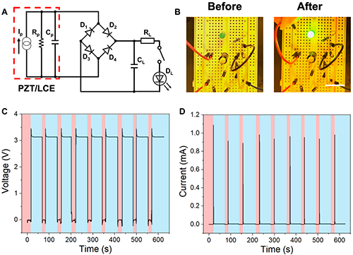 LCE/PZT 热释电能量收集器的应用演示。(A) 利用 LCE/PZT 热释电能量收集器为电容充电并点亮 LED 的电路示意图。(B) 绿色 LED 在供电前(左)和被 LCE/PZT 能量收集器点亮后(右)的照片。比例尺:2 cm。(C) 和 (D) 分别为 LED 在九个循环过程中的电压 (C) 和电流 (D) 变化曲线,其中粉色区域表示电容充电过程,蓝色区域表示 LED 供电过程。