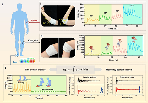 智能调温电子纺织品的主要创新在于其独特的织物多尺度、多层级的结构设计。首先,研究团队受气泡压力响应启发设计的"气泡压阻纱线"具有微气泡表面结构,实现了8.425 kPa?1的高灵敏度(较传统纱线提升12倍);其次,"交叉缠绕应变纱线"通过独特的拓扑结构确保了拉伸时导电网络的均匀变化和优异耐久性;此外,三重编织架构实现了传感、导热和导湿功能层的无缝融合。实测结果表明,该织物不仅能精准识别多种运动模式(包括手臂摆动和0-90°的膝关节弯曲),还能通过频域信号分析并区分行走与原地踏步等行为模式。此外,在40分钟户外跑步测试中,智能电子织物覆盖区域具有高汗液蒸发率,温度较未覆盖区低5.9℃(p<0.01),同时传感器信号保持稳定(变异系数<3%),展现了优异的热湿管理能力和环境鲁棒性。