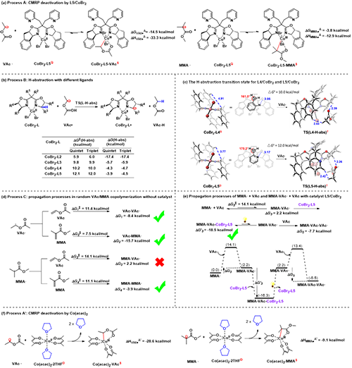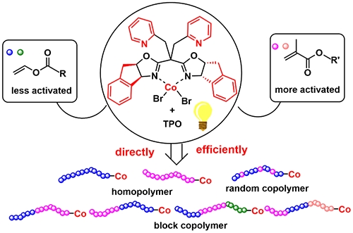 中国科学院上海有机所唐勇/王晓艳团队近几年在新型可控自由基聚合催化剂设计及其对高分子结构的精确调控等方面进行了一系列研究。近期,该团队分析了MMA与VAc两类单体共聚的四个自由基加成过程,发现MMA自由基与VAc单体的加成是稳定的共轭三级碳自由基向活泼的非共轭二级碳自由基的转变过程,在热力学上极为不利,容易发生逆反应,为共聚过程的主要障碍。该团队的策略是采用结合(钝化) 能力强的催化剂,捕获活泼的二级碳自由基生成休眠物种,增强其热力学稳定性,避免逆反应的发生,使这个过程变得可能。该团队设计了含有茚基骨架和吡啶边臂的双噁唑啉/CoBr2 催化剂,用于光诱导钴调控的自由基聚合(CMRP),其具有遮蔽的配位环境,避免了溶剂和单体极性基团的配位影响,与传统CMRP 催化剂相比,对不同增长链自由基具有更强且差异化的结合(钝化) 能力,避免自由基副反应发生的同时,干预了高、低活性单体共聚的自由基加成过程,缩小了两类单体的竞聚率差异,首次直接便捷地获得乙烯酯和甲基丙烯酸酯的二/三嵌段共聚物,以及组分分布均匀的无规共聚物。深入的机理研究与聚合结果一致,验证了CMRP机理和催化剂设计理念。本研究通过合理设计催化剂,成功实现了反应活性差异极大的两类单体共聚物的简捷合成,这一突破或将有助于高性能催化剂及聚合物材料的发展。该工作以 “A SaBOX/Co catalyst designed for facile access to the challenging copolymers of vinyl ester and methacrylate” 为题发表在《Nature Communications》上。文章通讯作者为中国科学院上海有机所王晓艳副研究员和唐勇研究员,第一作者是上海有机所与上海科技大学联合培养博士生丁一杰以及上海有机所博士生张圣业。该研究得到了国家自然科学基金委员会、中国科学院前瞻战略科技先导专项以及上海市科学技术委员会的支持。
