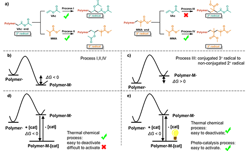 合成高活性与低活性单体的共聚物面临极大挑战,因二者反应性和聚合行为差异显著。现有半间歇/半连续进料策略虽能合成部分共聚物,但需精密控制单体投料过程,对甲基丙烯酸甲酯(MMA)与醋酸乙烯酯(VAc)等反应性(竞聚率)差异极大的两类单体,更易形成组分分布极为不均的共聚物,甚至是包含均聚物的混合物。可控自由基聚合(CRP)虽能构建精密大分子结构,但现有体系(RAFT、ATRP等)均无法直接实现乙烯基酯与甲基丙烯酸酯的高效共聚,因为几乎所有的CRP体系只能控制一种类型 (高活化或低活化) 乙烯基单体的聚合。即便过程繁琐的CRP技术组合、刺激响应型RAFT切换或后修饰等间接方法也仅能合成相对简单的二嵌段共聚物,通常合成效率低且难以制备多嵌段或均匀无规共聚物。因此,乙烯酯与甲基丙烯酸酯的无规共聚物及嵌段共聚物的简捷制备,迄今鲜有成功案例,而实现其结构的精确调控则更具挑战性。