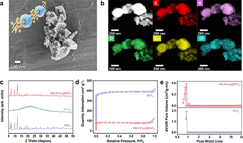 图2系统展示了MW-Ptriaz@MOFA的SEM/TEM形貌、元素分布、XRD谱图以及比表面积和孔径分布等表征结果,证明阳离子聚合物链已成功限域于MOFs纳米孔道中,同时材料的结晶性依然得以保持。