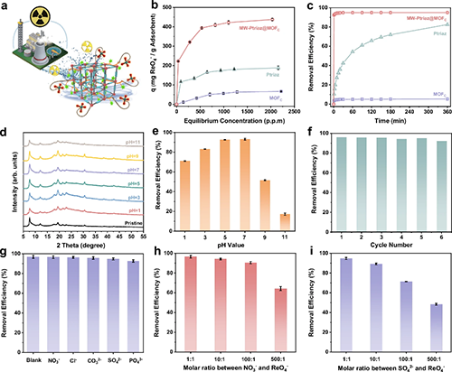 图3展示了以疏水性MOFC(CuTCPP)为载体构筑的MW-Ptriaz@MOFC的吸附性能。结果显示,该材料对ReO4ˉ的吸附容量可达438 mg/g,显著优于纯阳离子聚合物(188 mg/g)和MOFC(66 mg/g)。吸附动力学实验表明,其在1分钟内即可吸附超过92%的ReO4ˉ,并于20分钟内达到吸附平衡。此外,MW-Ptriaz@MOFC在pH 3~11范围内结构稳定,循环使用6次后吸附效率仍保持在90%以上,并且在模拟核废液的高浓度竞争阴离子环境(NO3ˉ、SO42-)中依然展现出优良的选择吸附性能。