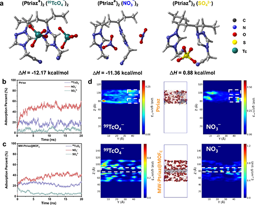 图5展示了基于分子编织的限域构筑对吸附行为的影响。结果表明,将阳离子聚合物链限域于疏水性MOFs的纳米孔道中,能够有效抑制对水合性阴离子(NO3ˉ、SO42-)的吸附,同时维持对99TcO4ˉ的高效识别与捕获,实现吸附选择性与效率的双重提升。