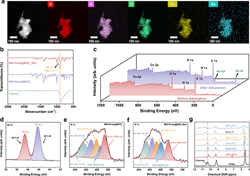 图4展示了MW-Ptriaz@MOFC在吸附ReO4ˉ后的TEM形貌、元素分布、红外光谱、X射线光电子能谱以及1H NMR谱图。结果表明,吸附过程不仅涉及阳离子聚合物与ReO4ˉ之间的静电相互作用,还包括阳离子聚合物中1,2,4-三氮唑鎓C5–H与ReO4ˉ之间的路易斯酸–碱对作用。