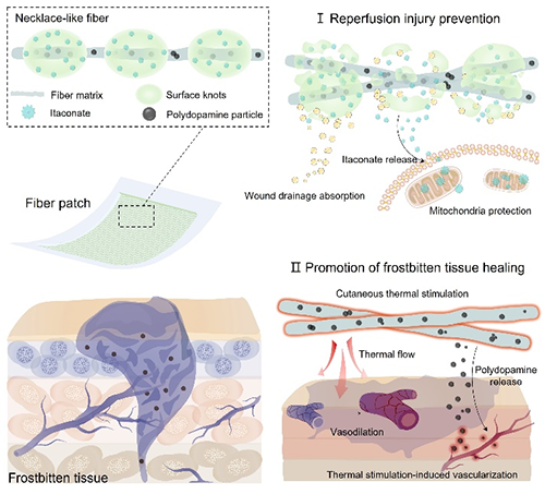 该工作以“Design and Development of Fiber Patch to Prevent Reperfusion Injury and Provide Thermal Stimulation for Treating Severe Frostbite”为题发表在《Advanced Functional Materials》上。文章的共同第一作者是西南交通大学的李西林博士和潘俊江硕士。该研究得到国家自然科学基金委的支持。