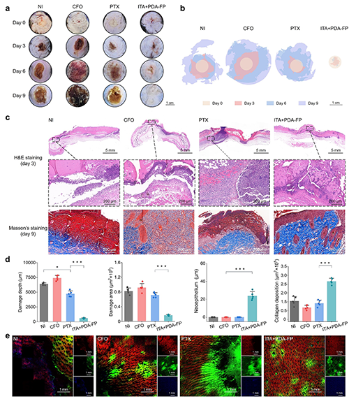 在三级冻伤模型研究中,该纤维贴片在加速组织修复方面展现出优于传统药物治疗的疗效(图3)。该研究所开发的纤维贴片作为一种便携式、可自主使用的冻伤治疗装置,展现出广泛的应用潜力。