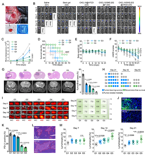 对HFCD的形貌及体外药物释放行为考察发现,HFCD能够实现时序性的缓解酸性微环境、释放免疫调控因子的功能(图2);通过荷GBM小鼠术后肿瘤防复发模型考察发现,该治疗策略能够有效抑制GBM术后复发,延长小鼠的中位生存期至49天,GBM小鼠的术后无复发率增加至40%(图3)。