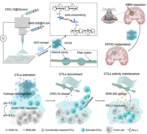 针对此问题,西南交通大学周绍兵/李西林团队设计并开发了一种水凝胶-纤维复合装置(HFCD),用于在术后局部时序性募集并激活CTLs,以增强免疫检查点阻断治疗效果,抑制GBM术后复发(图1)。