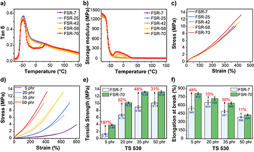 在此基础上,团队系统研究了等规结构占优势的PMTFPS 样品的晶体结构及非等温结晶动力学。结果标明,PMTFPS 的立体规整性显著影响晶面间距及晶体生长模式:随着规整性增加,晶面间距减小,晶体生长模式由一维针状结构和二维层状结构逐渐转变为三维球晶结构。此外,研究还探讨了了立体规整性对其弹性体力学性能的影响。高立体规整的 FSR-70 弹性体表现出显著的自增强效应:仅添加5份白炭黑补强后,其拉伸强度较 FSR-7 提升了 197%。本研究不仅系统揭示了 PMTFPS 立体化学规整性与结晶结构、热力学性能及力学性能的内在关联,更证实了调控非对称取代聚硅氧烷的立体化学构型是开发高性能硅橡胶弹性体的有效策略。