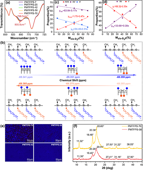 聚甲基三氟丙基硅氧烷(PMTFPS)是典型的非对称取代型聚硅氧烷,兼具优异的耐油性、耐溶剂性及宽温域热稳定性,在航空航天、汽车及高端电子材料领域应用广泛。然而,其立体化学序列对结晶行为、微观网络形成及力学性能的影响和调控机理仍缺乏系统研究。这不仅阻碍了氟硅橡胶高性能化的发展,也限制了其在极端环境下的应用潜力。因此,揭示 PMTFPS 的立体化学结构-性能关系,对指导高性能氟硅橡胶分子设计具有重要的科学价值和应用意义。