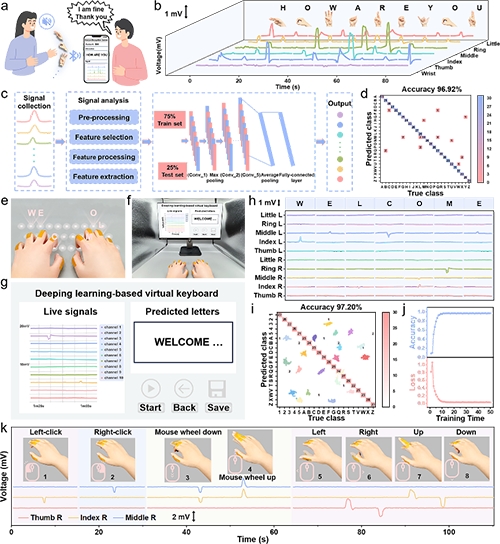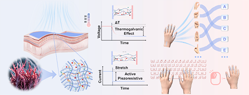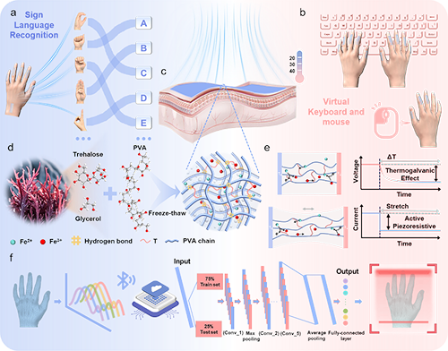 近期,太原理工大学集成电路学院张虎林教授团队设计了一款自供电水凝胶虚拟交互界面。受藻类极端环境适应机制的启发,该团队将海藻糖和甘油引入聚乙烯醇(PVA)水凝胶网络中,同时掺入氯化锂(LiCl)以增强导电性,最终设计出具有优异拉伸性、强粘附性和快速自愈合能力的水凝胶(PTGLi)。具有极简结构设计的水凝胶可以保形地粘附在手部以实现可穿戴性。利用热电效应和主动压阻效应的协同耦合,通过其对体温的固有响应以及在机械应变下的实时压阻调制,将动态手势转化为可检测的电信号,实现自供电传感。结合深度学习该界面可实现多种交互任务,例如手语识别、键盘文本输入和鼠标控制等,且特定任务的准确率超过96%,为具身交互领域提供了一种经济、高效且极具创新性的解决方案。该工作以“Self-powered versatile on-hand virtual interface enabled by thermogalvanic hydrogel”为题发表在《Chemical Engineering Journal》(IF=13.4)。太原理工大学硕士生魏瑞鑫为第一作者,通讯作者为太原理工大学张虎林教授。该研究得到了国家自然科学基金、山西省科技合作与交流专项和山西省研究生科技创新项目的支持。