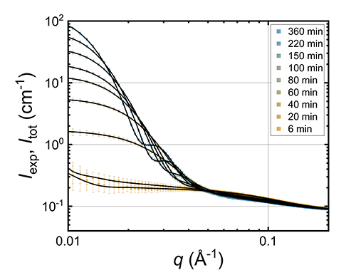 图1 使用TR-SAXS技术跟踪以PISA方式制备的PDMA–PDPA胶束成核与生长过程