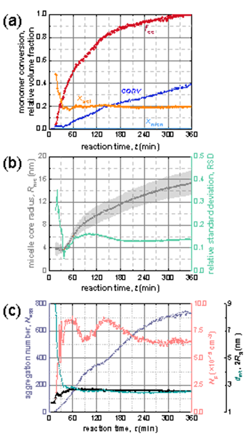 该研究首先对采用 PISA 方法制备的PDMA–PDPA两嵌段共聚物在混合极性溶剂中的形貌进行系统考察,发现动力学效应会导致结构多样性。为获得可控胶束体系,研究人员选择60/40 (w/w)的乙醇/水作为混合溶剂,使PDMA–PDPA稳定形成球形胶束。基于这一稳定结构,团队进一步结合TR-SAXS实验与定量模型(图1),获取了关于反应进程、颗粒尺寸演化及内部组分变化的关键信息(图2)
