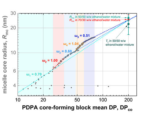基于 SAXS 的定量分析,该研究通过建立胶束尺寸与内疏水链段聚合度(DPco)之间的指数关系,揭示了 PISA 过程中两嵌段共聚物胶束核内的相态转变(图 3)。在成核阶段,只有少量链转移剂(macro-CTA)提供聚合位点,随即形成溶剂化的初始胶束核。随着聚合反应推进,溶剂逐渐排出并维持在核内一个相对稳定的比例,胶束尺寸在此阶段保持恒定。随后进入 ω1 阶段,胶束开始持续生长。由于反应在毛细管中进行,传质条件受限,使研究人员得以通过胶束聚集数观察到胶束融合及由此产生的链段拉伸效应(ω2与ω4阶段)。当融合作用减弱后,链段松弛导致相分离效应减弱(ω3与ω5阶段)。结合其他极性溶剂体系下 PDMA–PDPA 颗粒的静态SAXS数据可知,ω1、ω3与ω5阶段均可用于预测最终胶束尺寸,说明这些阶段代表较为稳定的相态,但其核内链段伸展程度有所差异,而这种差异源于初期成核与随后的融合状态。进一步,TR-SAXS 结果显示胶束内部几乎不含残余单体,这与此前在非极性溶剂体系中的研究(Angew. Chem. Int. Ed. 2024, 63, e202312119)显著不同。作者推测,这种单体耗竭与受限生长可能源于体系具有类乳液聚合特征,且单体扩散速率远低于聚合速率。