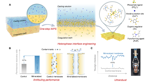 针对上述难题,哈尔滨工业大学邵路教授团队受自然界生物矿化过程的启发,提出了一种异相界面工程,利用原位耦合功能化策略在两相(溶剂相/非溶剂相)界面调控分离膜的矿化过程,合成具有优异抗污染性能和超强耐用的矿化膜(图1)。矿化膜表现出优异的抗污染性能(通量恢复率可达99%)和模量(与对照样相比提高4.1倍)。该研究提出的异相界面工程为一步制备仿生矿化功能材料提供了一种简单、温和的方法。