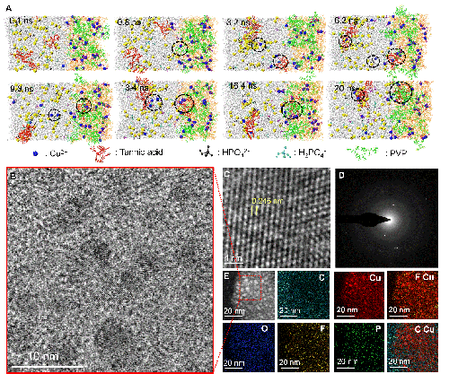 该工作使用单宁酸作为其中一种有机质调控界面矿化过程用于制备超强和优异抗污染性能的矿化膜。矿化膜在多次循环过滤过程中仍能保持优异的抗污染性能。通过分子动力学模拟分析了两相界面处的矿化机制,凝固浴(非溶剂相)中的单宁酸和磷酸根与铸膜液(溶剂相)中的铜离子同时向两相界面处移动,在界面处金属离子作为矿化的成核位点,与磷酸根结合形成矿物,单宁酸与金属离子螯合并进一步调控矿化过程,得到有机-无机矿化功能层(图2)。此外,通过改变有机质和金属离子的种类,可以得到具有不同功能(催化降解,光热转化)的矿化膜。本研究提出的异相界面工程有望在催化和太阳能海水淡化领域有广阔的应用前景。