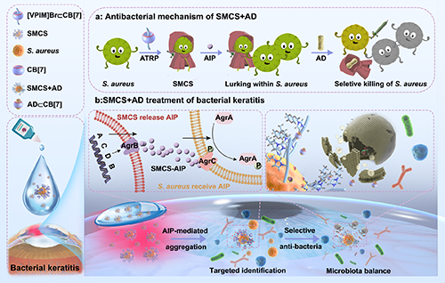 近日,内蒙古大学化学化工学院董阿力德尔图教授团队联合吉林大学化学学院杨英威教授团队在细菌感染治疗领域取得重要突破,开发了一种新型靶向抗菌技术,可高效杀灭金黄色葡萄球菌(Staphylococcus aureus)并维持角膜菌群平衡,为治疗细菌性角膜炎提供了新策略。
