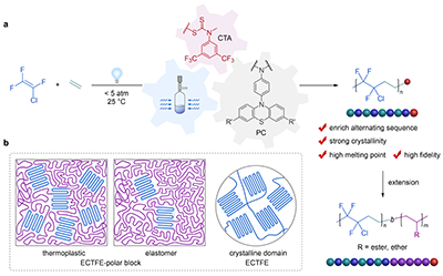 上世纪四十年代,美国杜邦(DuPont)公司首次报道了乙烯-三氟氯乙烯共聚物(ECTFE),发现该材料具有卓越的耐化学性、优异的热稳定性、出色的低渗透性等特点。随后,美国Ausimont公司于1974年成功实现了ECTFE商品化(商品名Halar®)。但ECTFE的传统合成方法采用较为严苛的高温高压自由基聚合条件(例如,70-300 °C,30-1000 atm),缺乏对共聚物一级结构的调控能力,导致共聚反应常常产生均聚物与共聚物的共混产物,且乙烯支化现象难以被抑制。更重要的是,ECTFE链末端缺乏“重启”基团,无法进行扩链反应合成嵌段聚合物,导致难以获得ECTFE基热塑性弹性体等高性能材料。