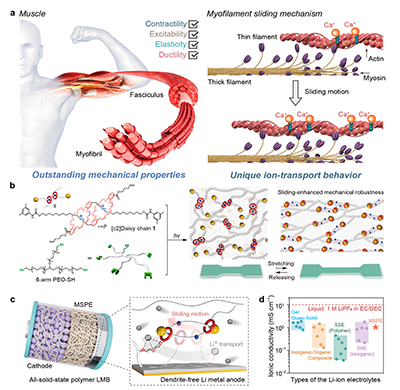 这项研究工作提出了一种全新的电解质设计范式:将具有可控滑动特性的“分子肌肉”作为功能单元引入聚合物网络,在分子尺度上实现了力学增强与离子传输的协同提升,成功解决了固态锂金属电池中“机械强度与离子电导率难以兼得”这一经典难题。这为开发下一代兼具高能量密度、长寿命和高安全性的全固态锂电池提供了崭新的思路和材料平台。