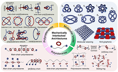 图1. 机械互锁分子和相关的聚合物、网络的结构多样性示意图,分为聚链烷、聚轮烷和分子结。