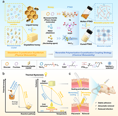 近期,四川大学李建树教授、罗珺副研究员团队基于相变蜂蜜仿生思路,通过调控天然小分子辅酶硫辛酸的温控聚合-结晶行为,设计出一种兼具强韧粘附(2.21 MPa)与超高切换效率(>99.9%)的热滞后可逆水下粘合剂。该粘合剂突破了典型热响应粘合剂温度-粘合强度单一对应的模式,通过模拟蜂蜜相变过程中的热力学与动力学能垒不对称性,展现出独特的热滞后特征,实现了生物体温下的双模态粘合与温和的触发切换。该研究为解决水下粘合剂中强度与可逆性之间的平衡提供了一种可持续途径,同时为设计非典型热响应粘合材料与可逆组织粘附系统提供了创新思路。