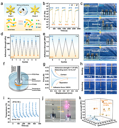 图2. PTAO8 的可逆水下粘附。(a)PTAO 的再加工与机理。(b)PTAO8 在温度循环下的流变曲线。(c)PTAO8 用于承重传递的可逆水下粘附测试。(d)固化 5 min 时 PTAO8 的可逆水下粘附。(e)固化 7 d 时 PTAO8 的可逆水下粘附(n ≥ 4)。(f)流变仪测试粘附力的示意图。(g)55°C 水下熔融 PTAO8 的力-位移曲线。(h)PTAO8 在微小物体的水下粘接与脱附。(i)间歇近红外照射下 PTAO8-CNT 的温度曲线。(j)利用 PTAO8-CNT 的近红外触发实现的水下物体释放。(k)PTAO8 与文献报道的温度响应型可逆水下粘合剂的对比。