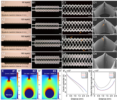 针对高层管状支架打印过程中电场变化引起纤维断裂的挑战,团队通过静电场模拟分析指导调节打印参数(图2)。结果显示,当升高接收距离,同时补偿相应电压,可有效消除电场不足引起的纤维断裂问题。基于此,团队成功打印了180层、形态完整且表面光滑的管状支架(内径为2mm)。