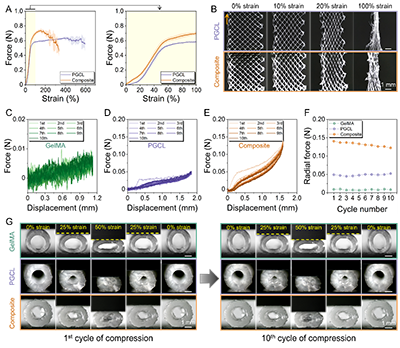 为进一步拓展应用场景,团队将PGCL支架与GelMA水凝胶复合,成功制备出兼具力学性能与生物活性的医疗器械。如图4所示,对于平面支架,仅引入10%的PGCL支架重量,即可使复合支架的初始拉伸刚度提升一倍;此外,PGCL赋予复合支架在初始加载阶段呈现典型J形应力-应变响应的力学特性,该特征与心肌等软组织的力学行为高度吻合,表明其具备在动态生理环境中的应用潜力。对于管状结构,复合管状支架充分发挥了GelMA的抗压性与PGCL的抗拉性,实现了力学的协同增强,在人工血管等领域中具备潜在优势。