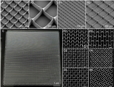 研究团队自主研发的MEW装置成功实现了长达100小时以上的PGCL连续稳定打印。研究表明,PGCL在85°C下加热96小时后,其分子量仅略微下降,热降解速率与PCL相当,并显著优于PLLA等聚合物。在此稳定加工状态下,团队制备出纤维直径6 μm、纤维间距为100 μm的高精度支架,并实现了多种非线性图案打印,如图1所示。