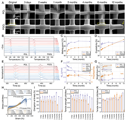近日,国立京都工艺纤维大学(Kyoto Institute of Technology, KIT)徐淮中团队成功实现了聚(乙醇酸-共-己内酯)(PGCL)的高精度3D打印,有望成为熔体近场直写(melt electrowriting, MEW)技术的第二种关键材料。该研究证实了PGCL不仅具备极高的打印稳定性,同时PGCL支架的快速可降解性和力学可调控性为开发医疗器械提供了新方案。