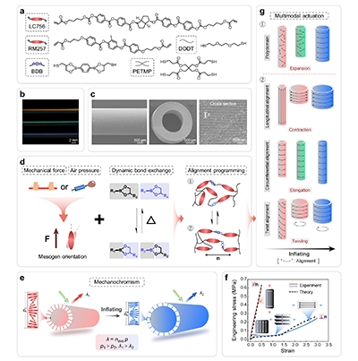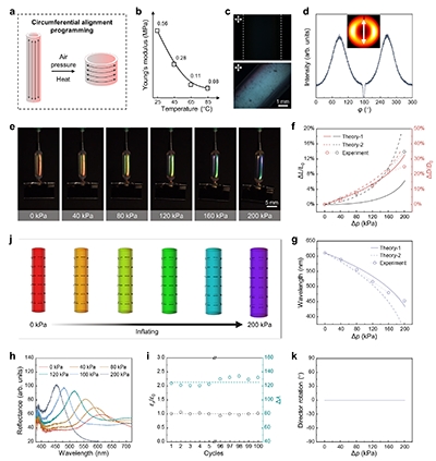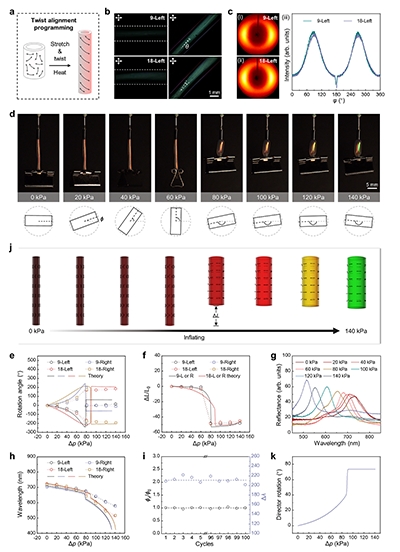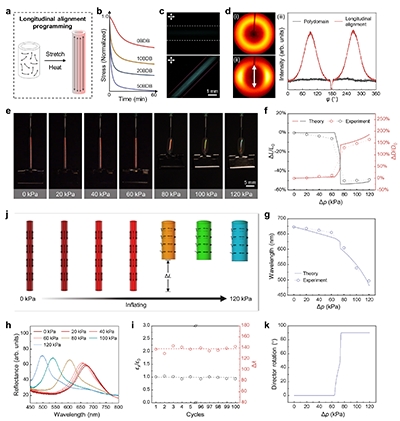 为此,清华大学化学系杨忠强课题组联合北京大学冯帆和剑桥大学John S. Biggins,开发出基于动态共价键与机械力/压力诱导取向的可编程CLCE空心纤维。通过精准调控分子在轴向、环向或扭转方向的排列,该纤维在充气作用下可实现膨胀、收缩、伸长、扭转等多种复杂形变,且同步产生结构色变化。研究团队建立了基于非理想新经典液晶弹性体能量的膜气球模型,成功捕捉到材料响应中的非单调性与亚临界性等关键力学特征。该工作为多响应CLCE的研究提供了全新范式,有望推动CLCE作为先进刺激响应材料,在柔性器件、智能驱动、自适应系统等领域的应用与发展。