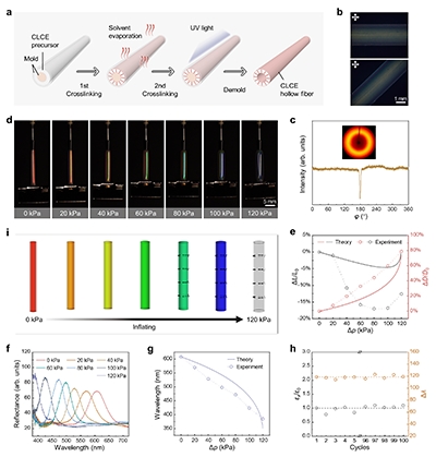 含动态B-O键的CLCE体系具备优异的动态键交换能力。通过对多畴空心纤维进行热激活编程,可制备出轴向取向CLCE空心纤维。依托力学各向异性与软弹性特性,该纤维在气动驱动下,液晶基元由轴向排列旋转为环向排列,实现约50%的轴向收缩、165%的径向膨胀,以及176 nm的反射波长蓝移。材料呈现独特的“平台—跳跃”响应特征:临界气压前形变微弱,达到阈值后瞬间发生大幅收缩。该机制为阈值型光学传感器、多级软执行器等器件设计提供了新思路。